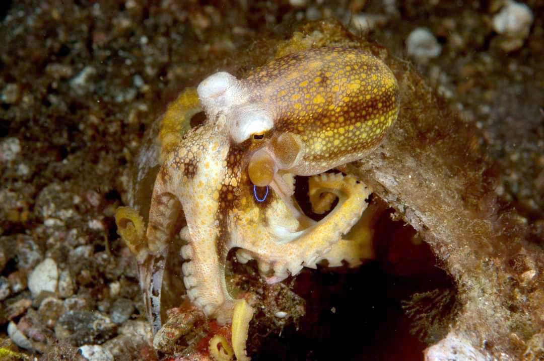 In Lembeh, we most often spot mototis at our rubble and combination dive sites which afford them crevices created by the coral rubble and rocks to secrete themselves in to. They are also seen at some of our black sand muck diving sites where they appear to prefer to hide themselves inside bottles, cans, and other manmade objects, as well as inside bi-valve shells rather than burying into the sand like other octopus species.