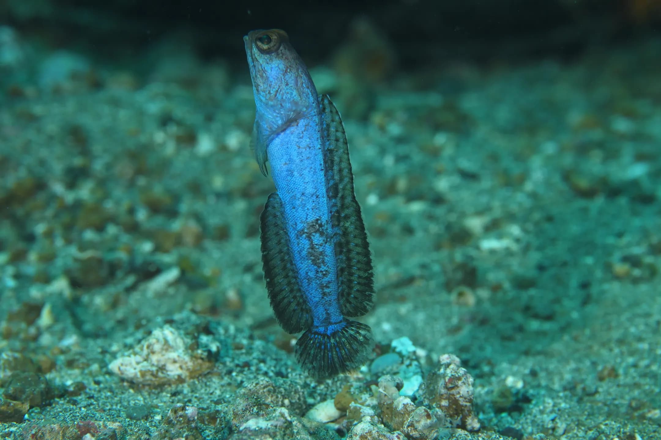 Brown base color to yellowish in lower jaw have bluish color also at dorsal and ventral fins. Stay solitary in hole at sand or rubble. Size is up to 10 cm.