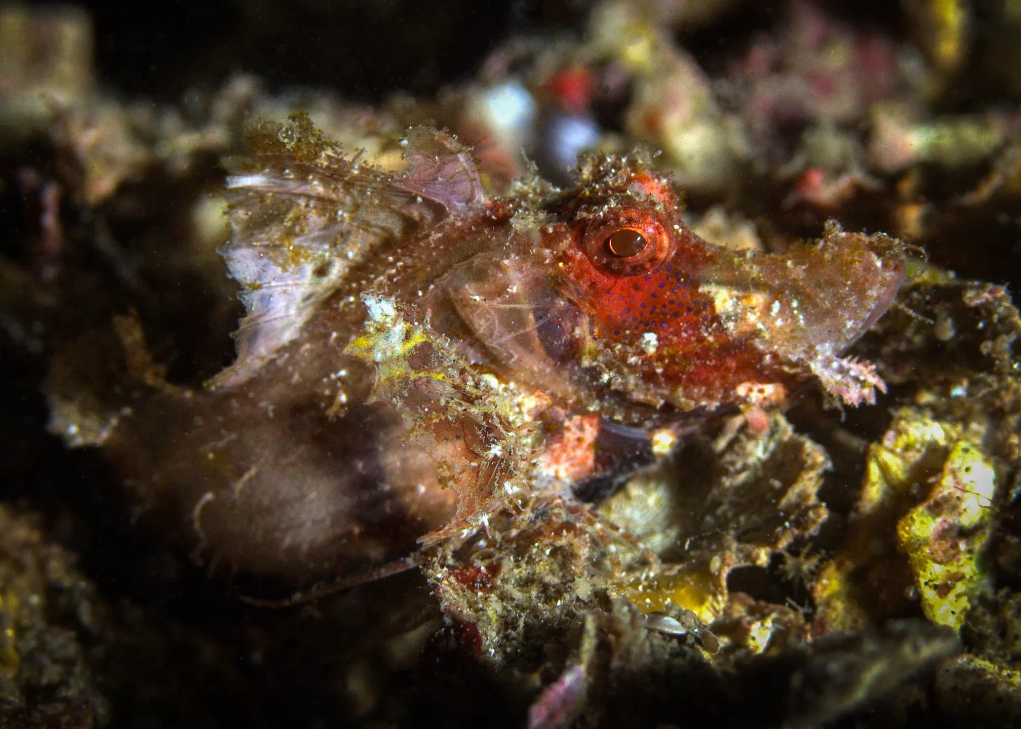 Lembeh’s iconic muck sites feature gentle slopes of volcanic sand scattered with debris, sponges, algae, and rubble.