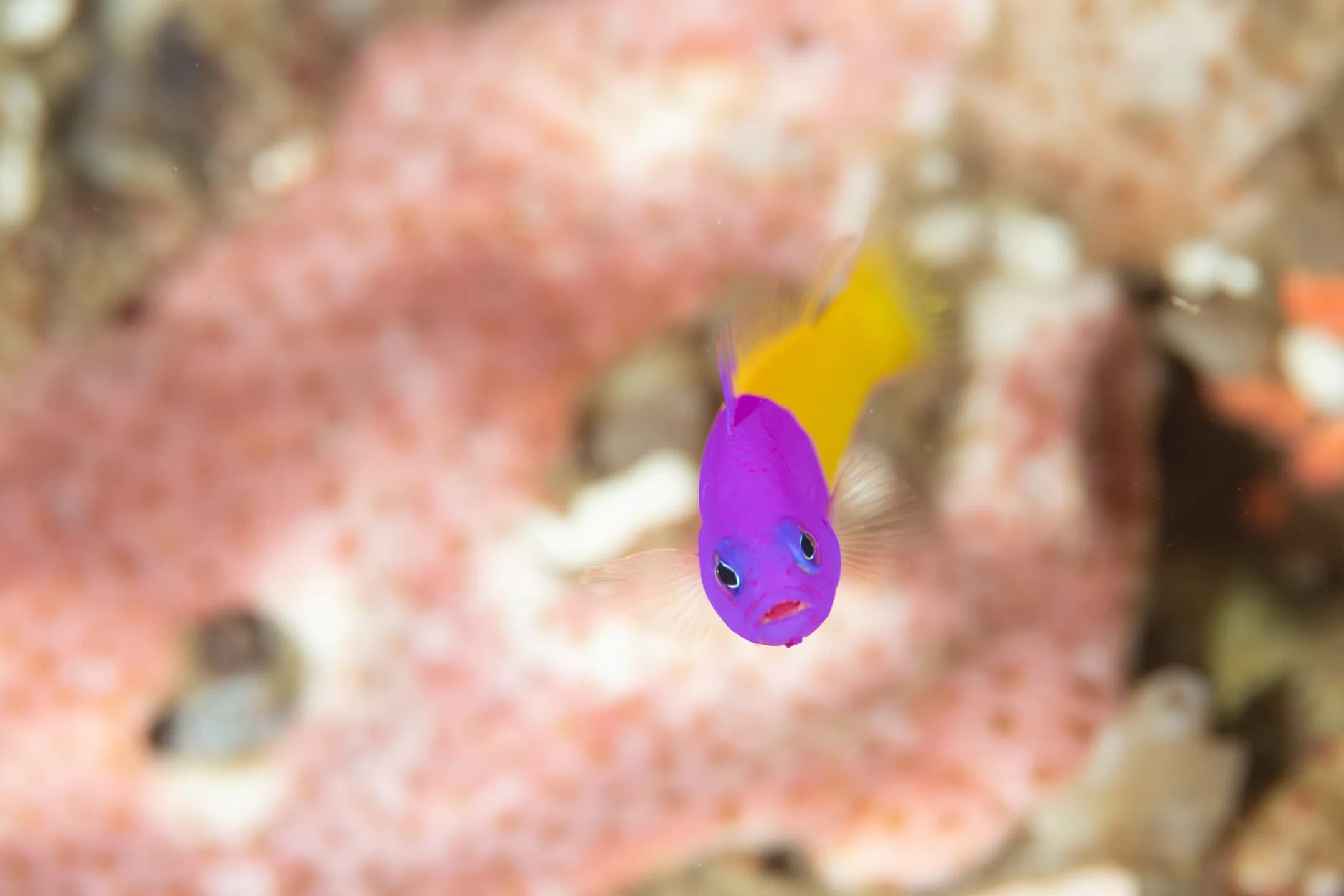 Also known as the bicolor dottyback, gramma dotty, or false gramma, this species is commonly kept in marine aquariums. The front half of the body is bright purple, fading to yellow on the posterior, and it typically grows up to 3 inches (7.5 cm) in captivity. Despite its small size, it is highly territorial and will defend its space against much larger fish, though it can coexist with many other common aquarium species.