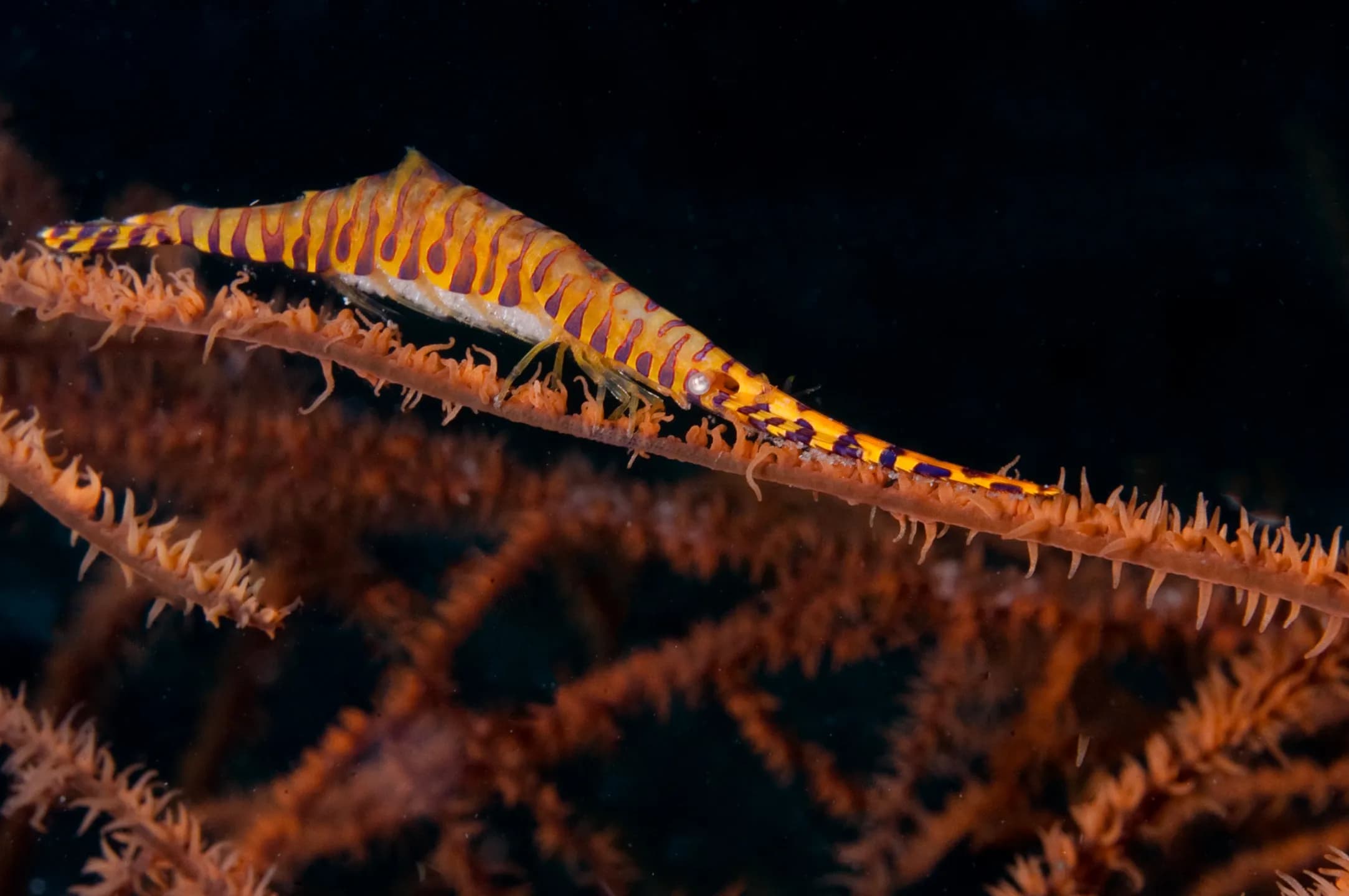 A shrimp species associated with black corals and sea whips. It has an extremely elongated, transparent body with irregular transverse camouflaging bands, allowing it to blend in perfectly with its coral host—not only in shape but also by mimicking the host’s color pattern. Individuals can appear white, yellow, orange, red, or a combination of these; the rarest color combination is yellow and blue. Though difficult to spot, they may remain on the same coral colony for several months. Found at depths of up to 20 meters.