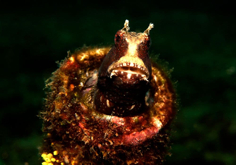 Commonly white to yellow with three balckish stripes. Solitary or in pairs. Mimics the striped blenny (Meiacanthus grammistes). Seek shelter in abandoned tube worm tubes, empty sea shells, discharged bottles or cans, in addition to colonial ascidians or among hydroids growing on mooring buoys.